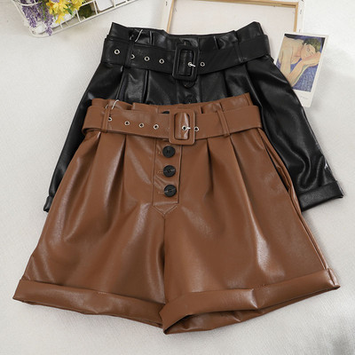 Ženske kratke hlače od umjetne kože s gumbima i remenom