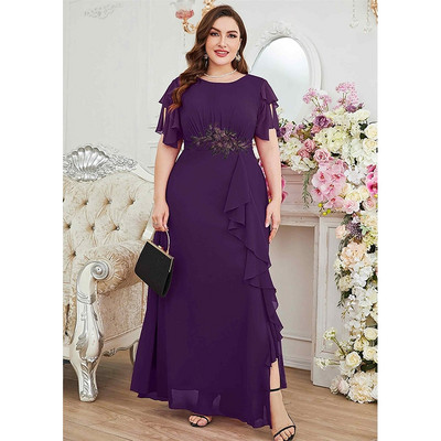 Ljetna ljubičasta crvena haljina od šifona plus veličine, luksuzna vjenčanica s aplikacijom na volane, mixi haljina s okruglim izrezom velikih veličina za žene