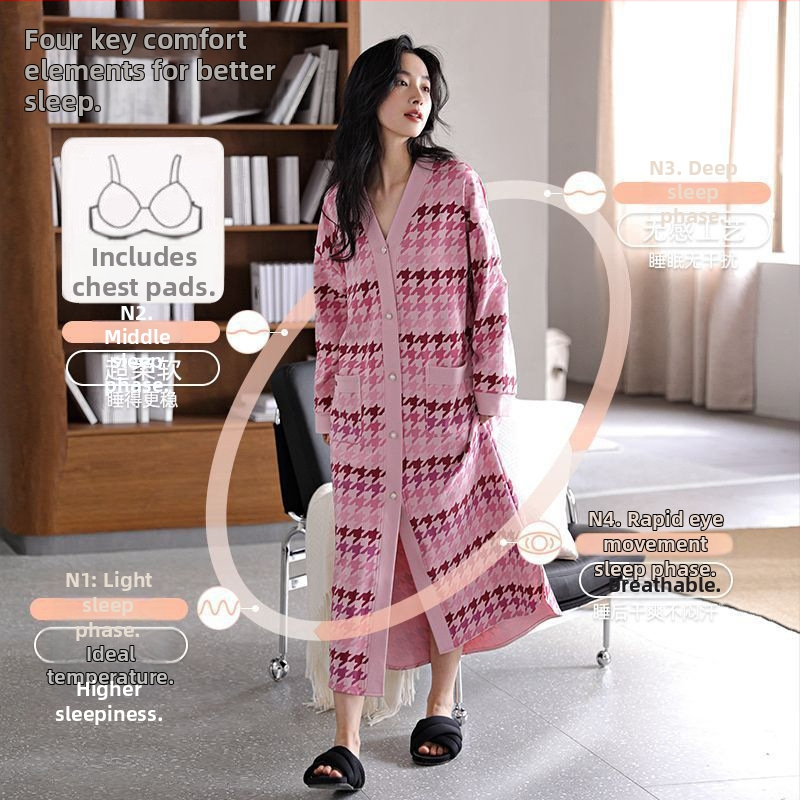 Noćna haljina od 100% pamuka s umetkom za poprsje, žene, dugi rukavi, V-izrez, srednje duljine, slobodan kroj, za jesen