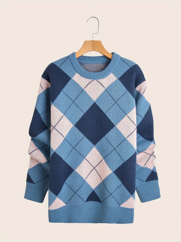 Prekogranični jesenski i zimski muški pleteni pulover s rombovima u kontrastnoj boji, okrugli izrez, ležerni, dugih rukava